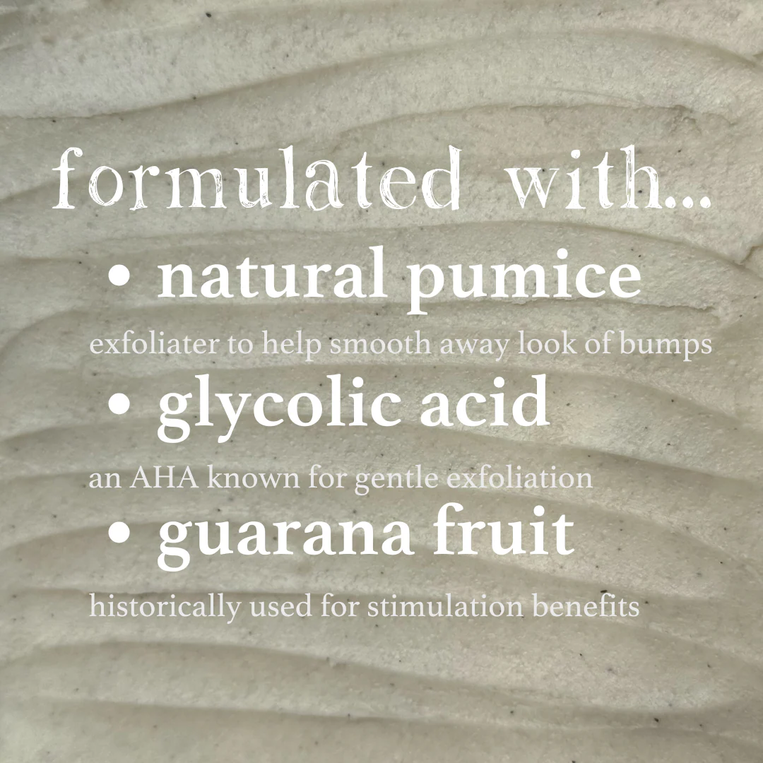 Aqua (Water), Pumice, Glyceryl Stearate SE, Cetearyl Alcohol, Glycerin, Cocos Nucifera Oil, Decyl Glucoside, Kaolin, Stearic Acid, PEG-4 Rapeseedamide, Magnesium Aluminum Silicate, Parfum (Fragrance), Benzyl Alcohol, Phenoxyethanol, Glycolic Acid, Dehydroacetic Acid, Disodium EDTA, Benzyl Salicylate, Coumarin, Octadecyl Di-t-Butyl-4-Hydroxyhydrocinnamate, Paullinia Cupana Seed Extract, Sodium Benzoate, Potassium Sorbate.